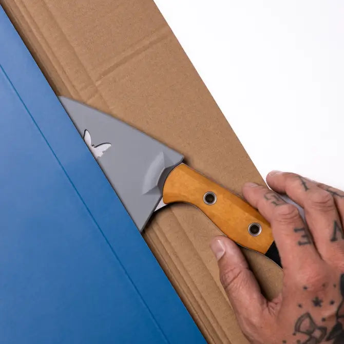 Fixed blades: Use your original sheath if you’ve got it. If not, the paper blade sleeve does the job. Simply peel off the adhesive backing and firmly affix the face to blade through the slots provided in the sleeve.